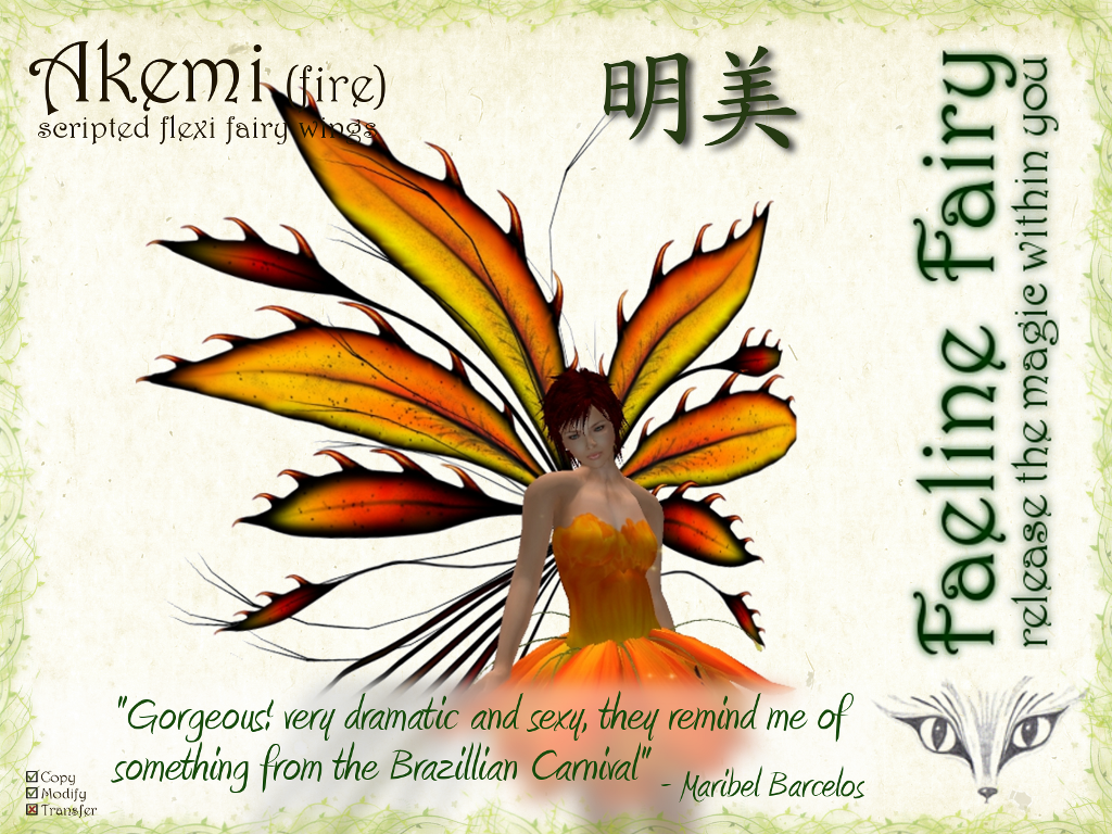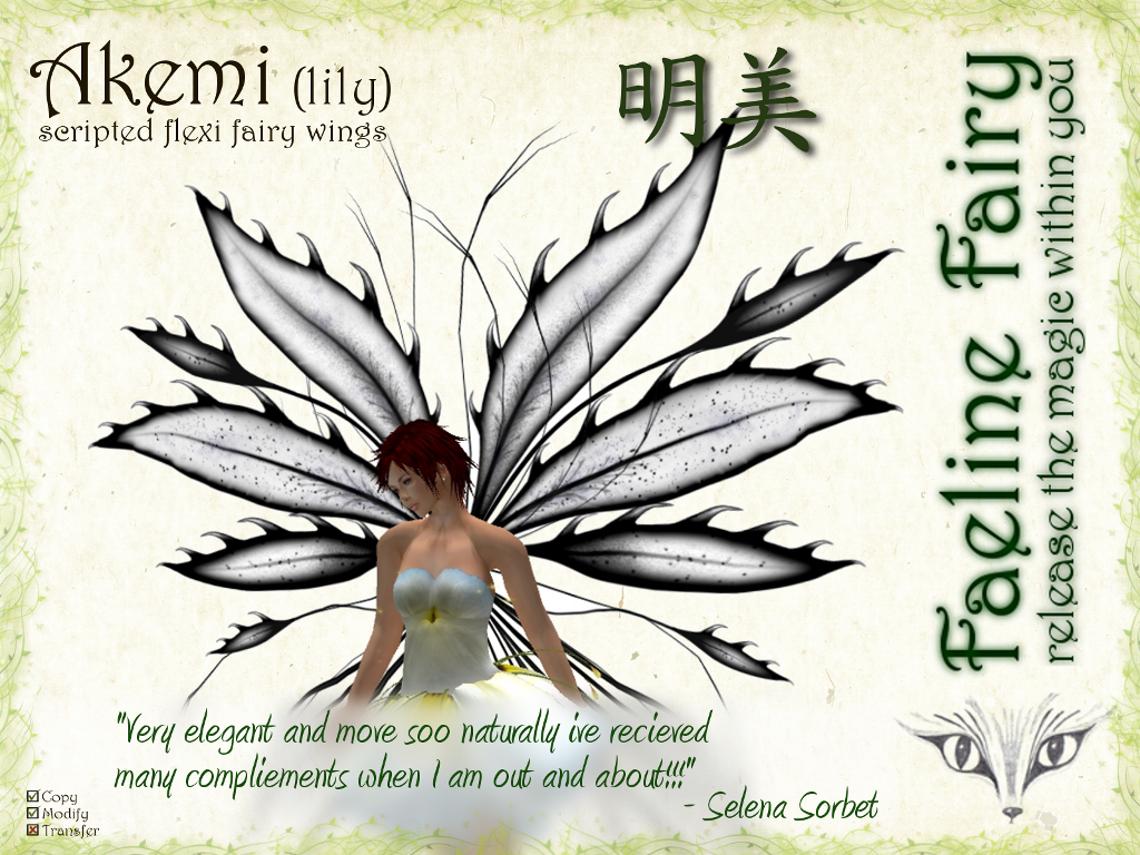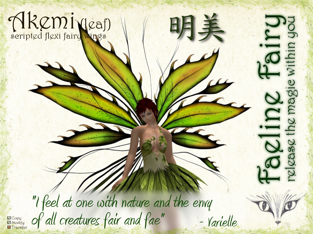 | Akemi is an exuberant, wild, outrageous fairy full of energy that she uses to revitalize nature and those around her. Her leafy bright wings reflect her youthful spirit. Her job, in the fairy world, is to care and heal those who are injured in soul or body. | |||||||||||||||||||||||||||||||||||||||||||||||||||||||||||||||||||||||||||||||||||||||||||||||||||||||||||||||||||||||||