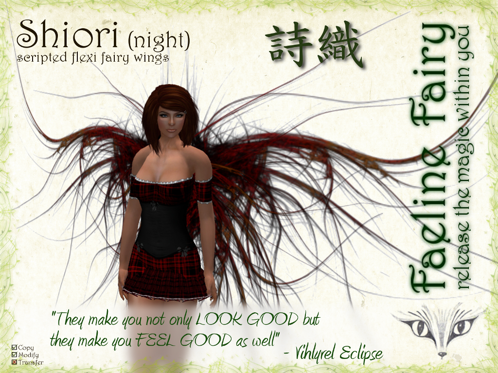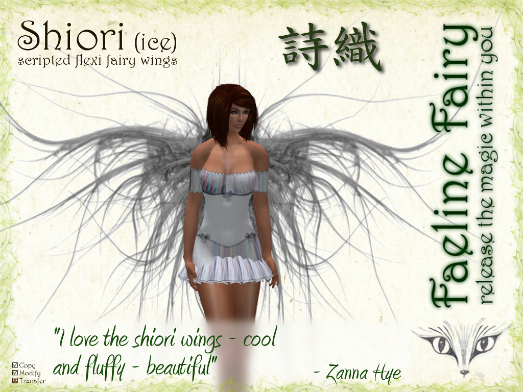 | Shiori wings, exuberant, unconventional, with vibrant and soft colors, are this fairy's weapon, along with her magic and wisdom, to raise the newly born faeries. As is well known, each time a baby laughs for the first time a fairy is born. Then Shiori will take her and will guide her until she is mature enough to take her place in the fairy world. | |||||||||||||||||||||||||||||||||||||||||||||||||||||||||||||||||||||||||||||||||||||||||||||||||||||||||||||||||||||